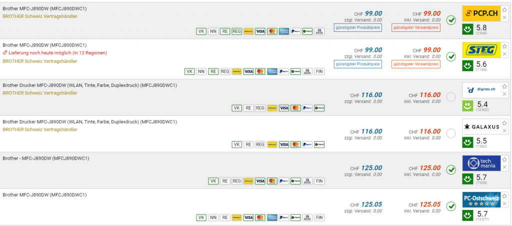 Bei Steg gibt es momentan den Brother MFC-J890DW Drucker zum neuen Bestpreis von CHF 99.-. Der vorherige Bestpreis und auch zweitbeste Preis bieten galaxus digitec mit CHF 116.- an.