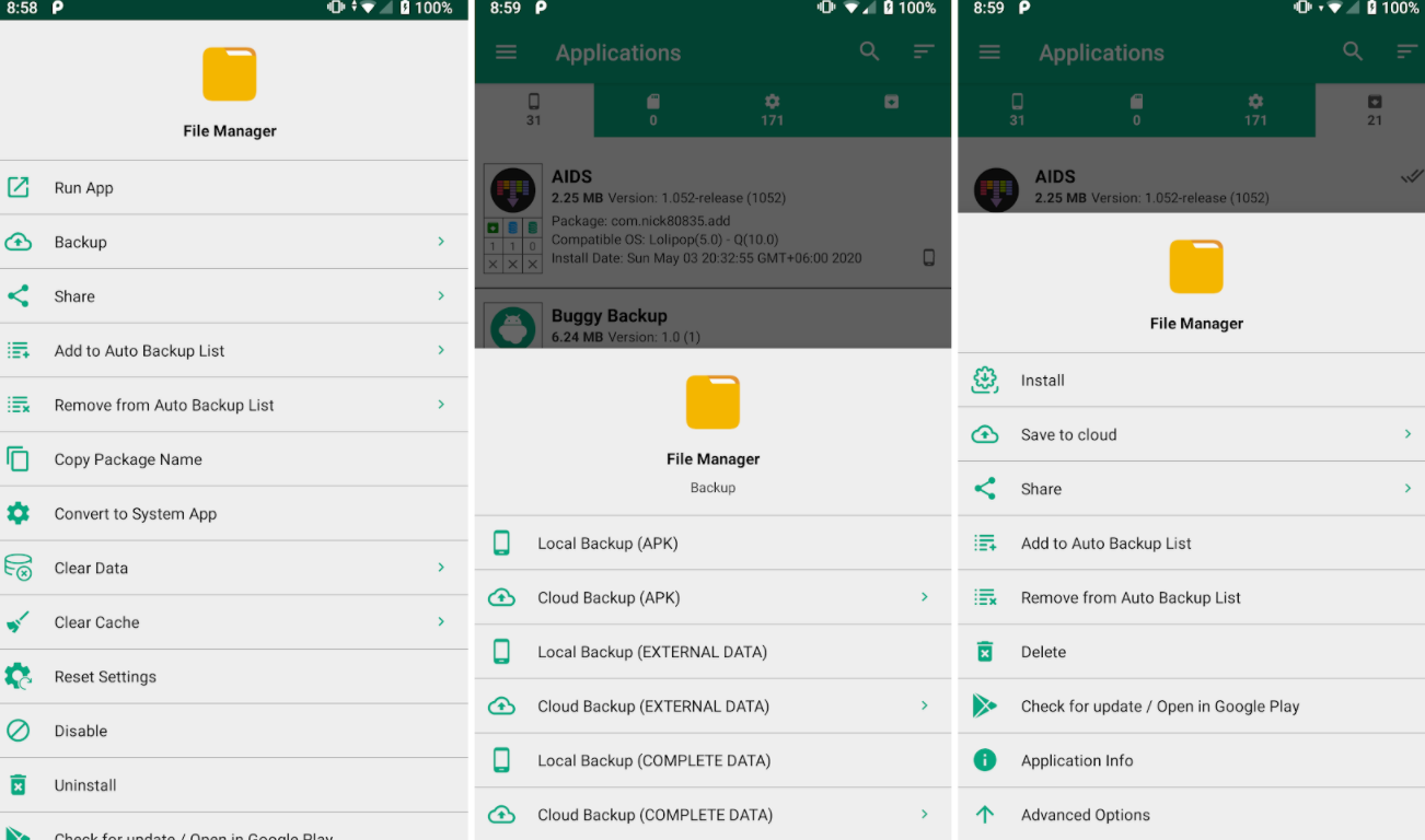• Sehen Sie sich detaillierte App-/Backup-Informationen an und greifen auf erweiterte Optionen für jede App zu.
