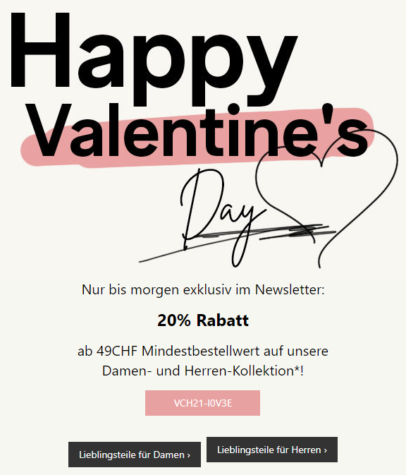 Nur heute gibt es bei C&A mit dem Gutscheincode „VCH21-I0V3E“ -20% Rabatt auf Damen- und Herrenkollektion. Der Gutschein kann ab einer Bestellung von CHF 49.- eingelöst werden. Gilt auch auf bereits reduzierte Artikel. C&A bietet ebenfalls eine kostenlose Rücksendung an!