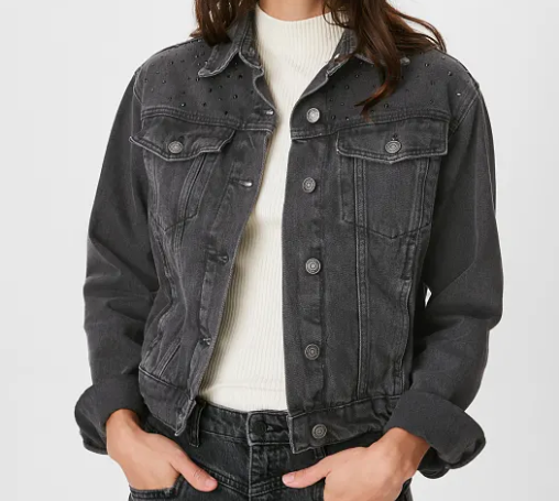 Diese dunkelgraue Jeansjacke mit Schmucksteinen an den Schultern gibt es für CHF 24.95 plus CHF 5.90 Versand. Die Jacke ist noch in den Grössen XS, M und L verfügbar.