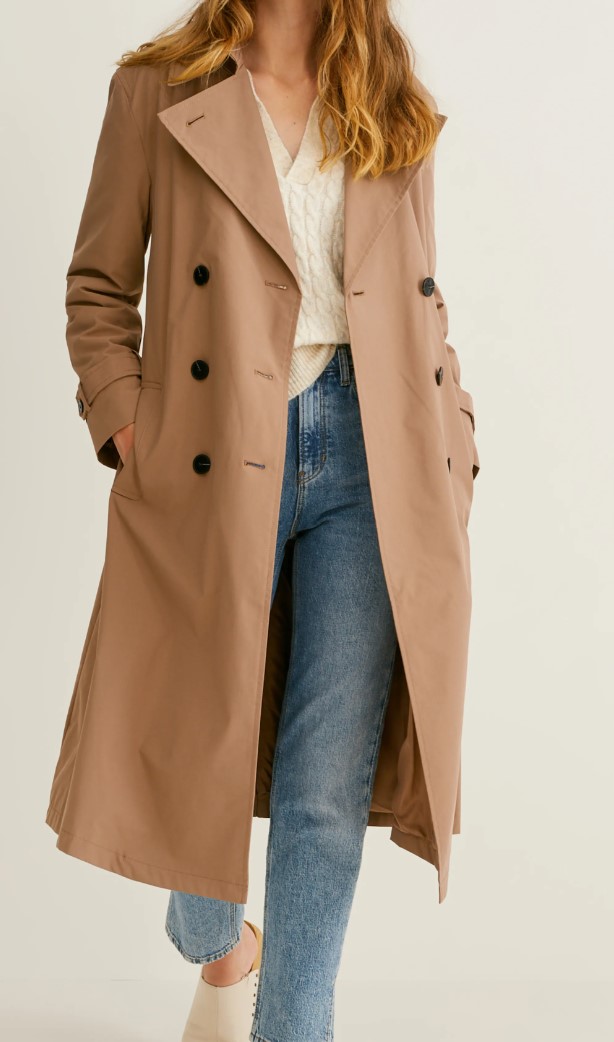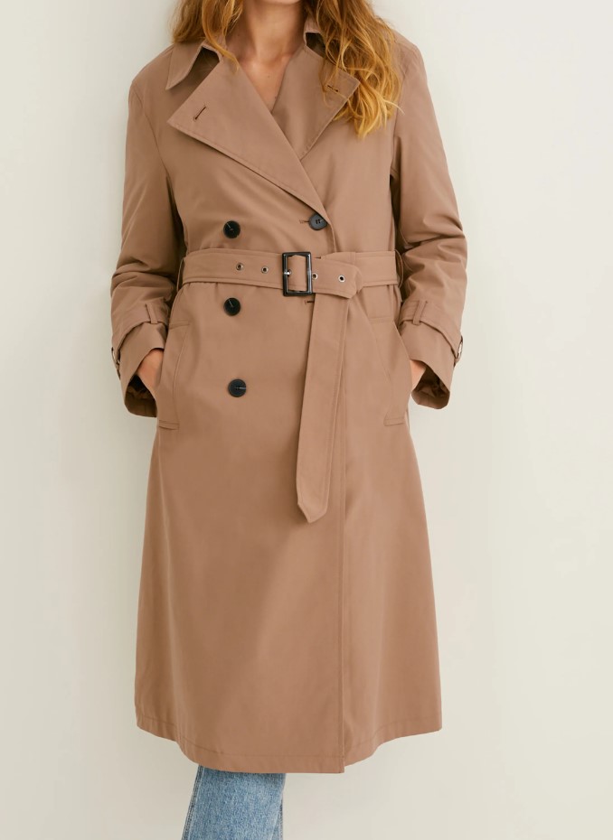 Trenchcoat aus glattem Material. Stoffgleicher Gürtel mit Metallschließe und zwei seitliche Eingrifftaschen. Ärmelabschlüsse mit weitenregulierbaren Riegeln und Stoff-Innenfutter.