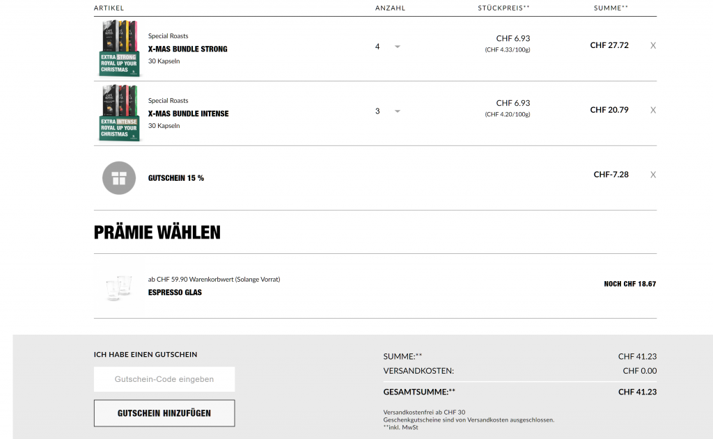Um den 33% Coupon einzusetzen, muss man für mindestens 40.- bestellen. Ab einem Bestellwert von 60 Franken gibt’s noch zwei Espresso-Gläser gratis obendrauf.