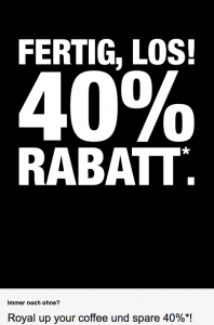 *Hinweis: Mit diesem Gutscheincode erhältst du einmalig 40% Rabatt bei einem Mindestbestellwert von CHF 30 und einem maximalen Bestellwert von CHF 300 in unserem Onlineshop. Die Accessoires, Café Royal Office Pads und Selection Boxen sind vom Rabatt ausgeschlossen. Der Rabattcode ist einmal pro Person einlösbar und bis 30.04.19 24 Uhr gültig.