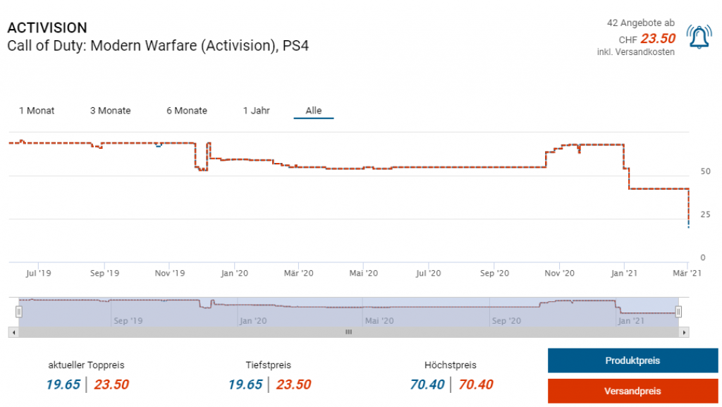 Beim eher unbekannten Onlineshop internet.ch gibts derzeit das Spiel Call of Duty: Modern Warfare (2019) in französischer Fassung zum Preis von CHF 24.20. Laut toppreise soll dies ein neuer Bestpreis sein. Der Vergleichspreis liegt derzeit zwar bei etwa 26 Franken, das liegt aber daran, dass dieses Produkt kürzlich einen Preissturz erlebt hat. Bei digitec & Co. fangen die Preise z.B. erst ab 42 Franken an.
