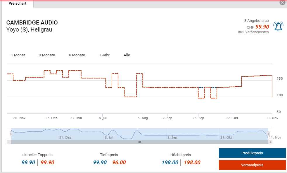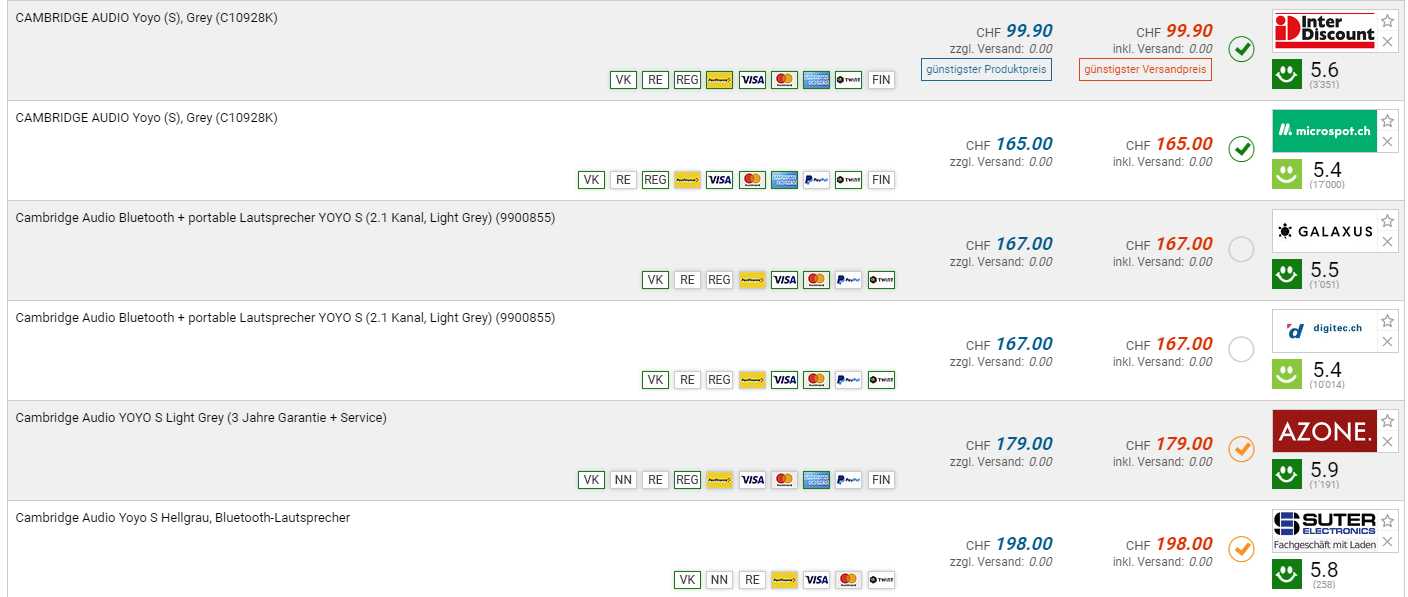 Bei interdiscount gibt es den CAMBRIDGE AUDIO Yoyo für den Bestpreis von CHF 99.90. Zuletzt war der Preis im Juli bei CHF 99.95. Der zweitbeste Preis beträgt CHF 165.-.