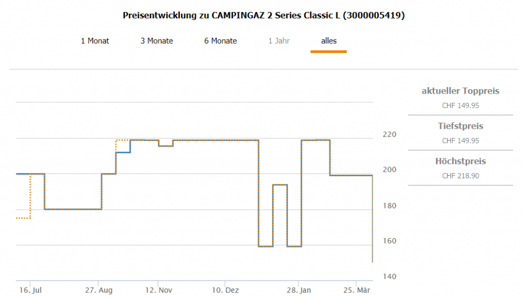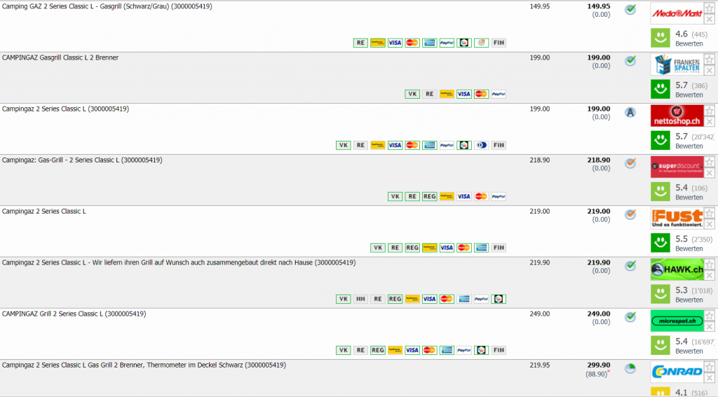 Bei MediaMarkt gibt’s den Campingaz 2 Series Classic L Gasgrill für CHF 149.95 Zweitbester Preis in der Schweiz liegt bei CHF 199.- Bestpreis war bei CHF 159.-