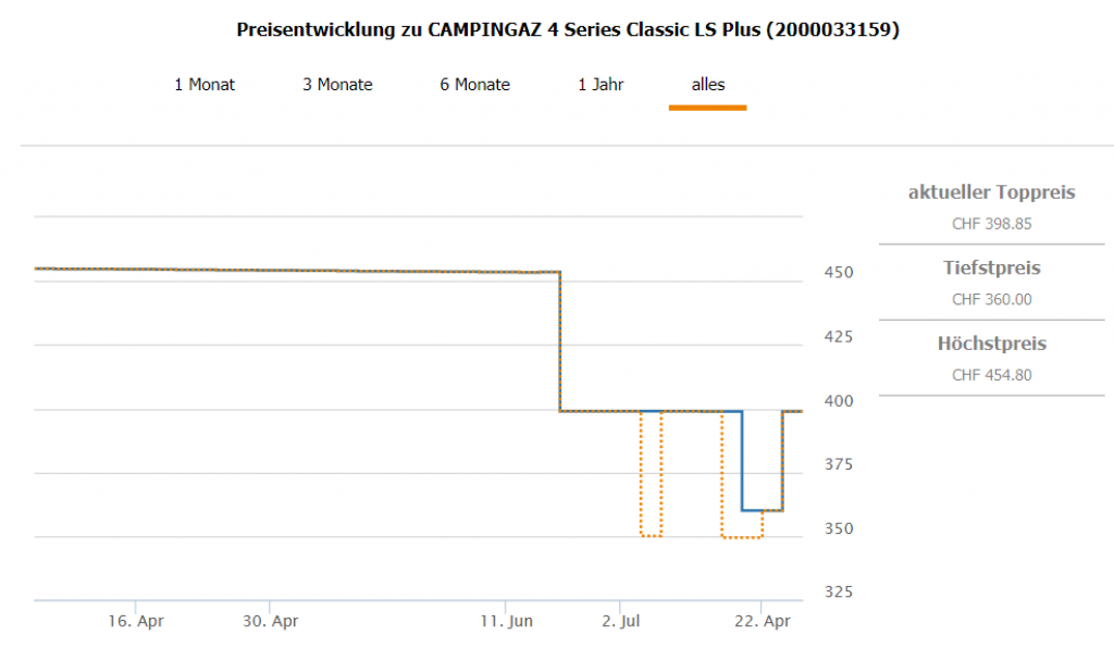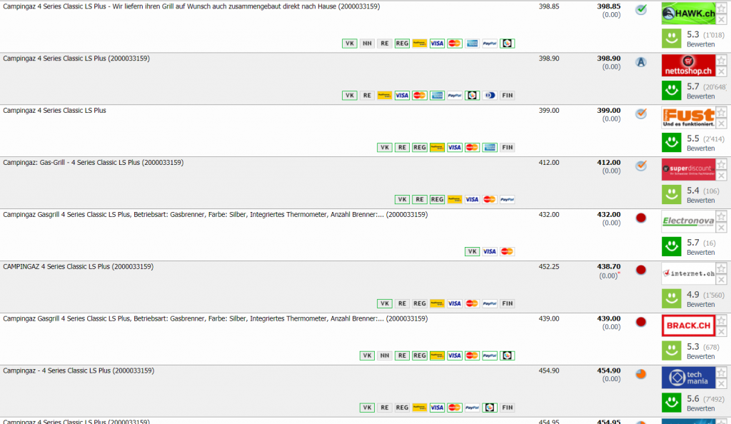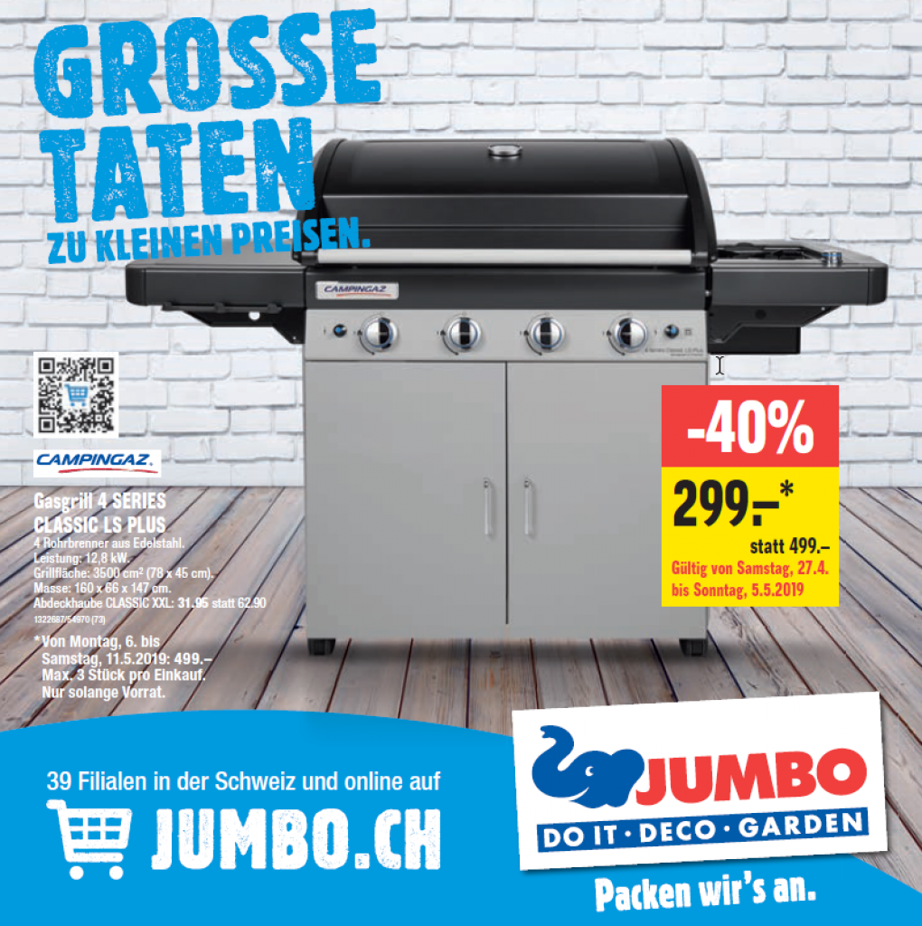 Bei Jumbo gibt’s bis am 5. Mai den CAMPINGAZ 4 Series Classic LS Plus für CHF 299.- Empfehlung ist, den Grill abzuholen da der Preis für die Lieferung relativ hoch ist (CHF 65.-) Bisheriger Bestpreis war bei CHF 349.30 Zweitbester Preis im Moment beträgt CHF 398.85