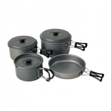 Dieses hochwertige Trekking-Kochset ist besonders leicht, sehr kompakt und extrem robust. Das eloxierte Aluminium gewährleistet eine besonders gute Wärmeleitung, ist leicht zu reinigen und rostet nicht. Die Griffe bleiben auch beim Kochen kalt und lassen sich ganz einfach platzsparend umklappen.