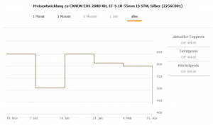 Bei MediaMarkt erhält man gerade die silberne Version des CANON EOS 200D Kit, EF-S 18-55mm IS STM für CHF 444.- Zweitbester Preis in der Schweiz liegt bei CHF 599.- Bestpreis war bei CHF 509.- Die schwarze Version gibt’s im Moment ab CHF 499.- Bestpreis war dort bei CHF 467.10
