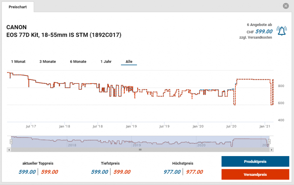 Aktuell gibt es bei Melectronics die EOS 77D im Kit mit einem 18-55mm F4.0-5.6 Objektiv für schlappe CHF 589.- (in Kombination mit dem Gutschein aus dem Newsletter).