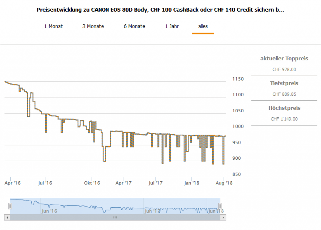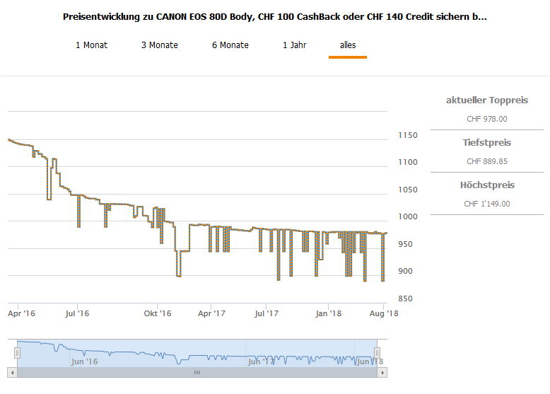 Gemäss toppreise gab es den Body bislang nie günstiger als für 889.85 CHF, der zweitbeste Preis liegt momentan bei 978.- CHF.