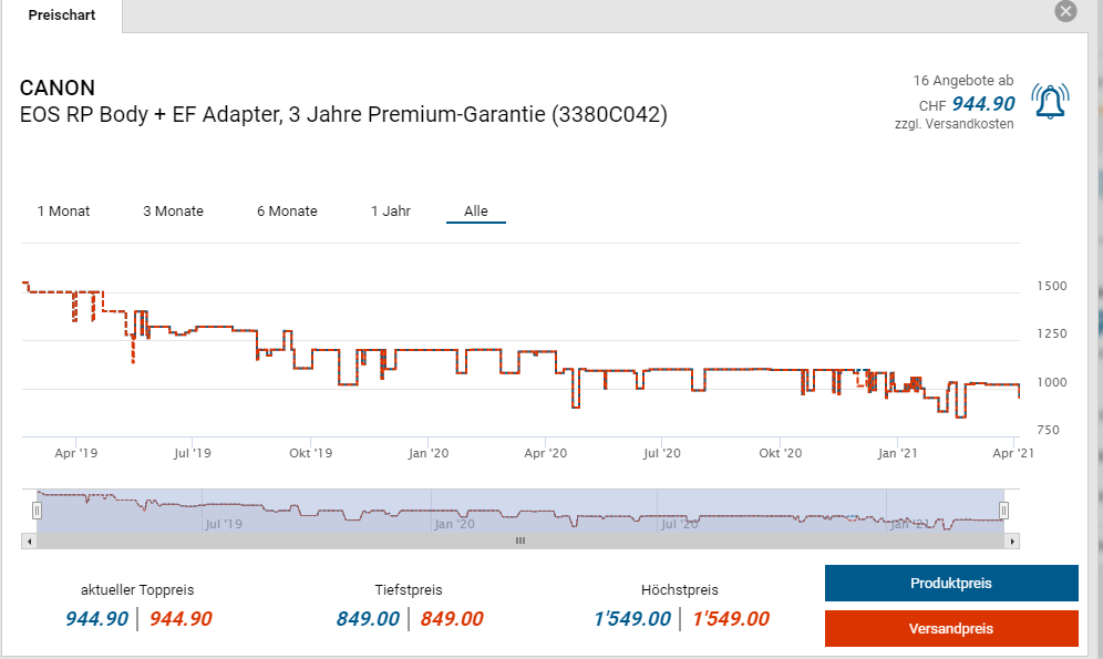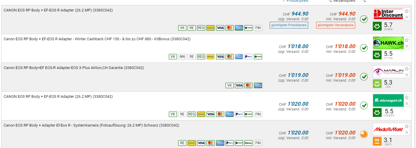 Bei Digitec gibt es die CANON EOS RP Body + EF Adapter für den neuen Bestpreis von CHF 829.-. Der vorherige Bestpreis war CHF 849.-. Der zweitbeste Preis beträgt CHF 944.90.