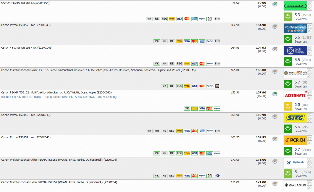 Bei microspot gibt’s gerade eine nette Aktion zum CANON PIXMA TS8152 Drucker, Scanner und Kopierer. Und zwar gibt’s das Teil für CHF 79.- . Zusätzlich kann man sogar noch 35 Franken Cashback erhalten. Insgesamt kommt man also auf 39.- Der zweitbeste Preis in der Schweiz liegt bei CHF 164.90 (auch da ginge Cashback), günstiger als 144.90 gab’s den Pixma TS8152 noch nie.