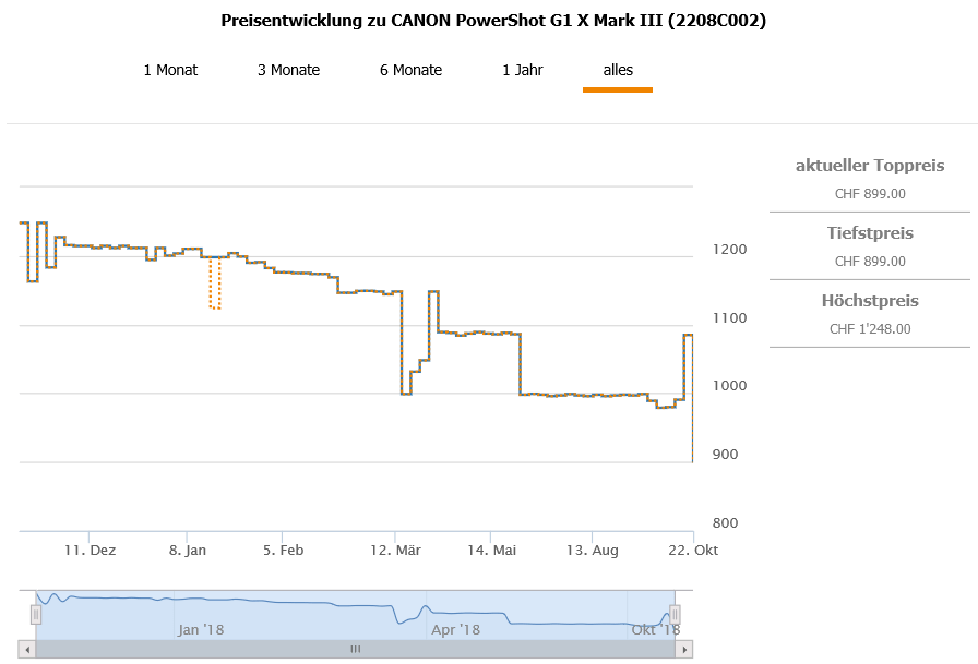 Gemäss toppreise gab es die Kamera bislang nie günstiger als für 979.- CHF, der zweitbeste Preis liegt aktuell bei 1084.95 CHF.
