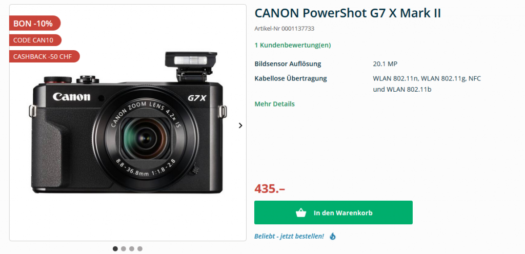 Canon G7X II aktuell mit Rabattcode = 391.50- CHF (toppreis: 478.95- CHF)