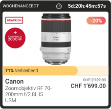 Neuer Bestpreis für das Canon RF 70-200mm F/2.8L IS USM Zoomobjektiv bei TWINT.