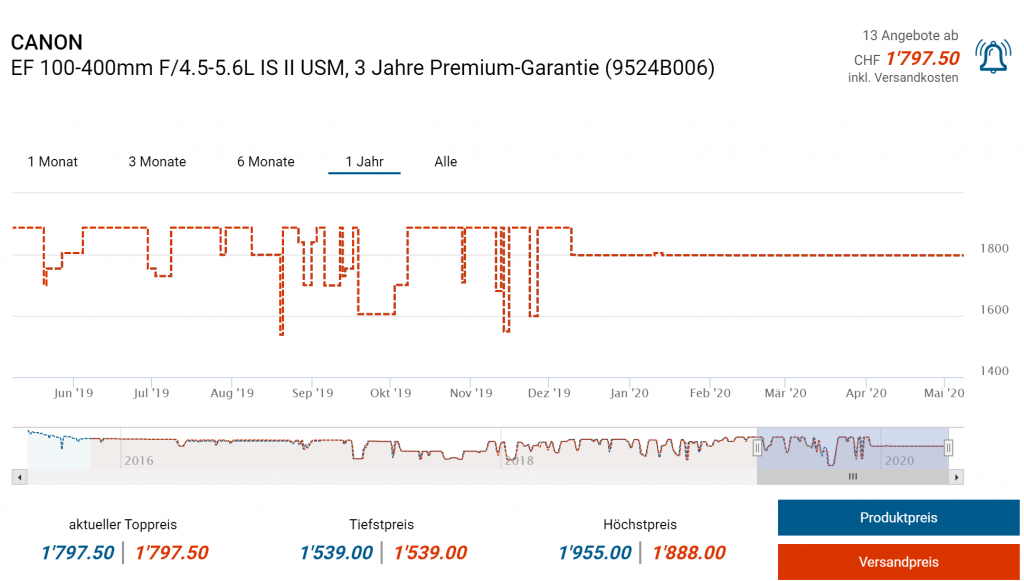 Bei Amazon.it gibt’s gerade das Canon Teleobjektiv, EF 100-400 mm f/4.5-5.6L IS II USM SLR für umgerechnet CHF 1’305.- In der Schweiz bezahlt man für das Teleobjektiv ab CHF 1748.- Bestpreis war bei CHF 1539.-