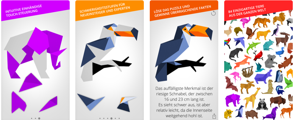 In diesem Puzzle Spiel kannst Du auf Deinem Handy oder Tablet durch Kombinierung der geometrischen Puzzlesteine zu einer Tierfigur die vielfarbige Tierwelt bestaunen.