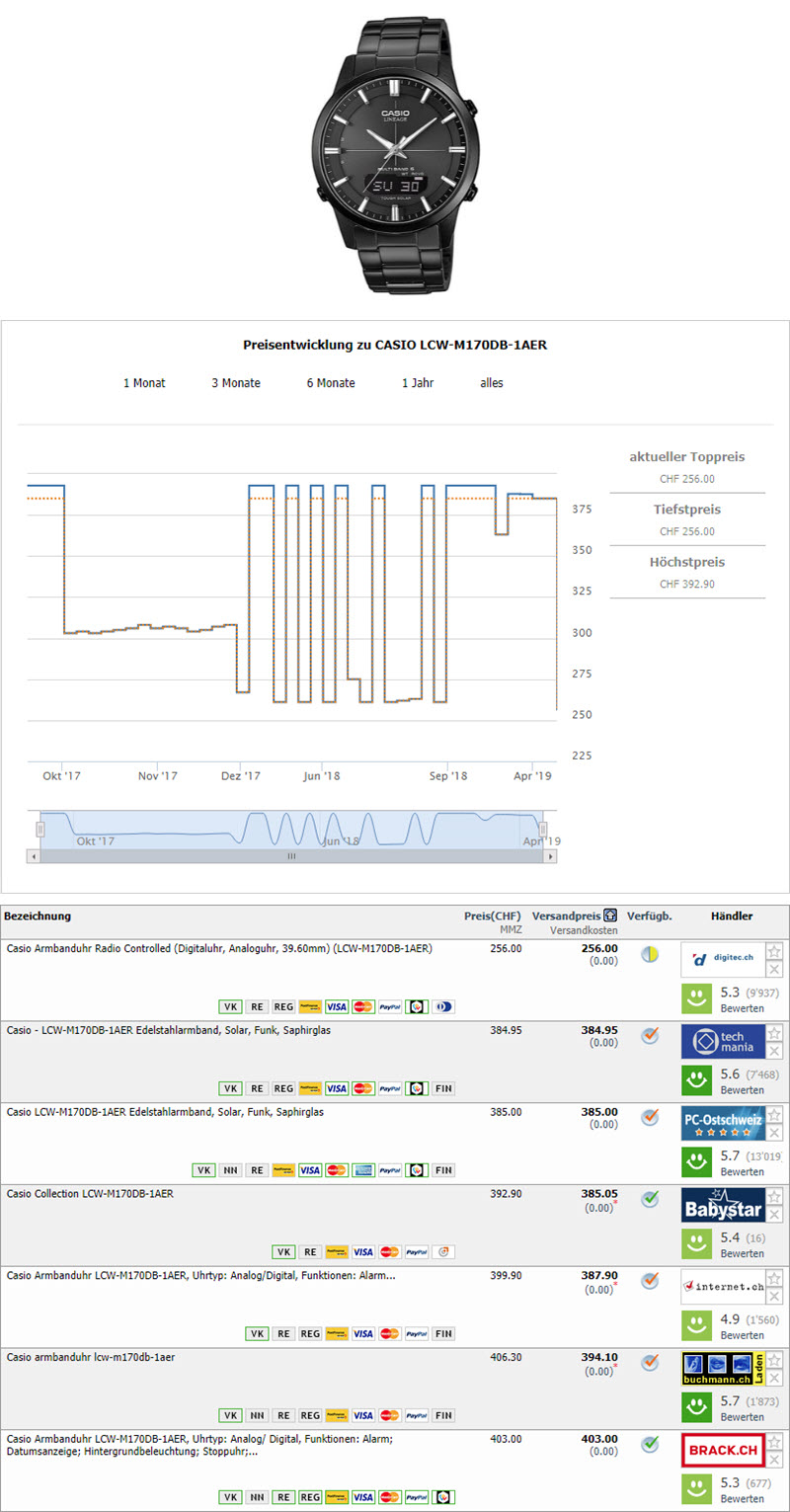 Bei Amazon kostet die Uhr incl. Versand und Verzollung in die CH knapp 240 CHF.