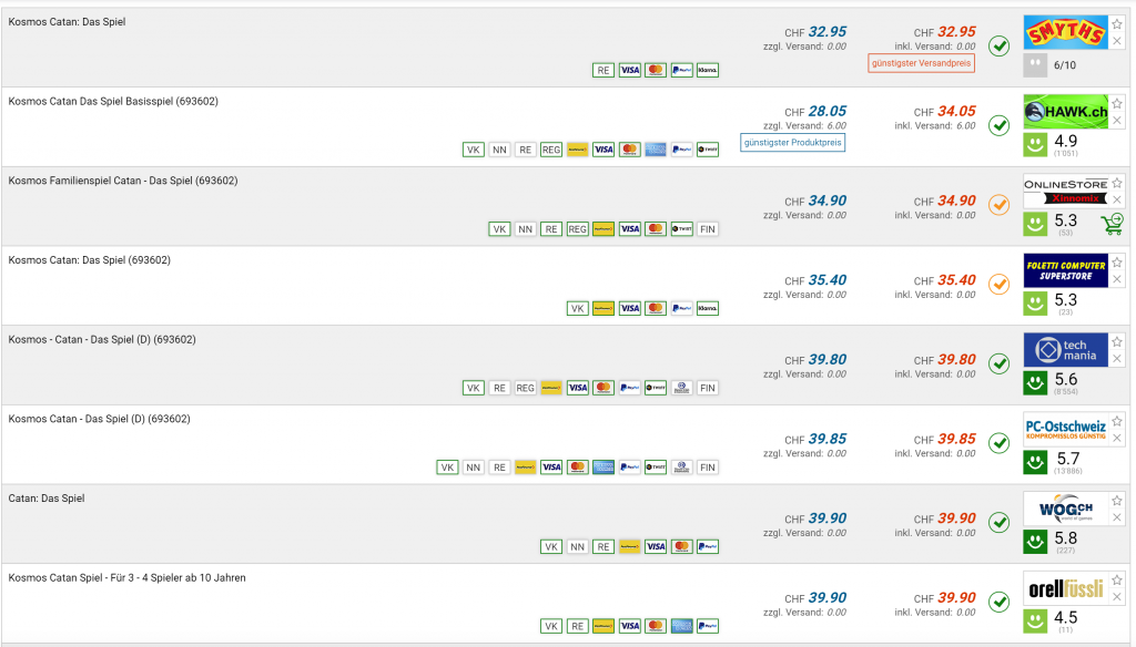 Bei Amazon erhält man gerade CATAN - Das Spiel für umgerechnet CHF 26.80 Franken inklusive Lieferung und Verzollung. Wenn man noch mehr Artikel bestellt (um auf einen Warenwert von 49 EUR zu kommen) bezahlt man gar nur EUR 16.28