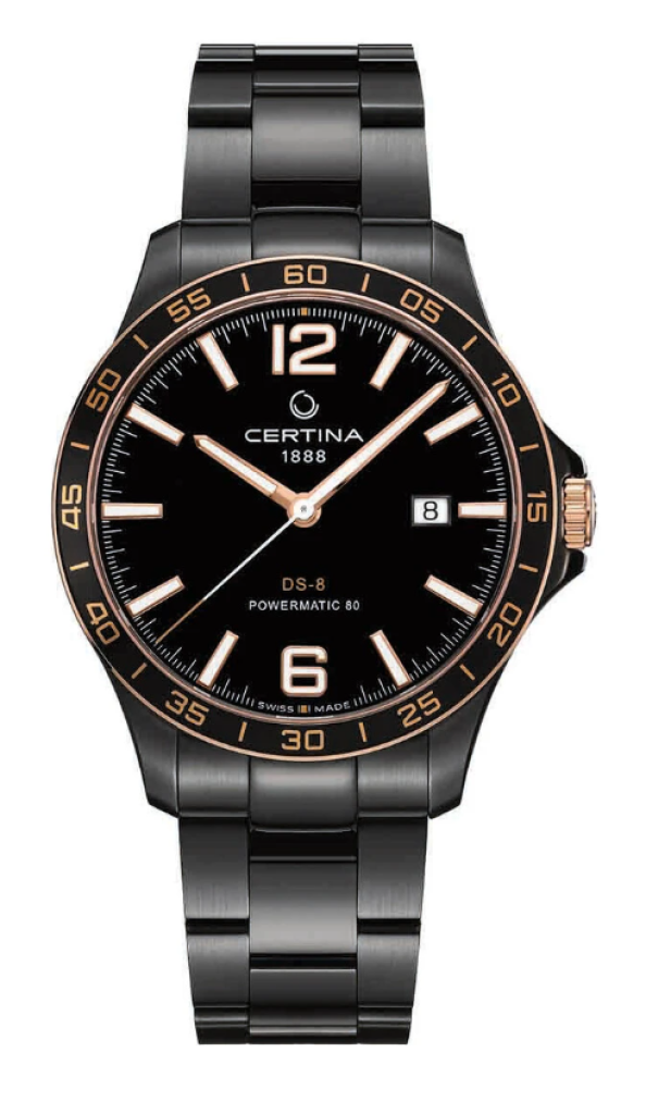 Diese markante Certina DS-8 Powermatic 80 Herrenuhr überzeugt durch ihr puristisches, modernes Design. Ihr rundes Edelstahlgehäuse mit einem Durchmesser von 40.50 mm und einer Höhe von 11.62 mm wirkt elegant und robust zugleich. Die schwarze Lünette aus Edelstahl und Aluminium mit PVD-Beschichtung fügt sich harmonisch in das schwarze Zifferblatt ein, das mit Indizes und arabischen Ziffern sowie einer praktischen Datumsanzeige bei 3 Uhr ausgestattet ist. Die mit SuperLuminova beschichteten Zeiger und Indizes erleichtern das Ablesen bei Nacht. Geschützt wird das elegante Zifferblatt durch kratzfestes, einseitig entspiegeltes Saphirglas. Die Uhr bietet eine Gangreserve von 80 Stunden, ist bis zu 100 m wasserdicht und verfügt über eine Nivachron-Spiralfeder für hohe Genauigkeit. Das Swiss Made POWERMATIC 80.611 Automatikwerk garantiert jahrelange Zuverlässigkeit. Das schwarze Edelstahlarmband mit PVD-Beschichtung und Butterfly-Verschluss rundet das moderne Design perfekt ab und macht diese Uhr zu einem stilvollen Accessoire für Männer, die sich etwas trauen