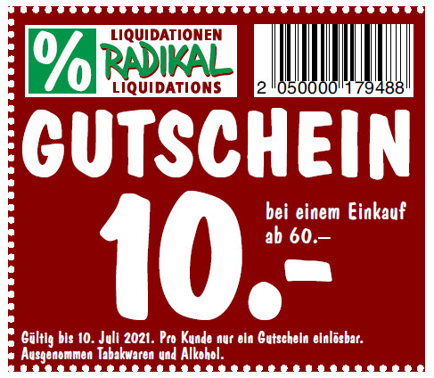 Bei Radikal (Pendant zu Otto’s) gibt es aktuell einen CHF 10.- Bon, welcher ab einem Einkaufswert von CHF 60.- an der Ladenkasse verwendet werden kann (gültig bis 10.7.2021).