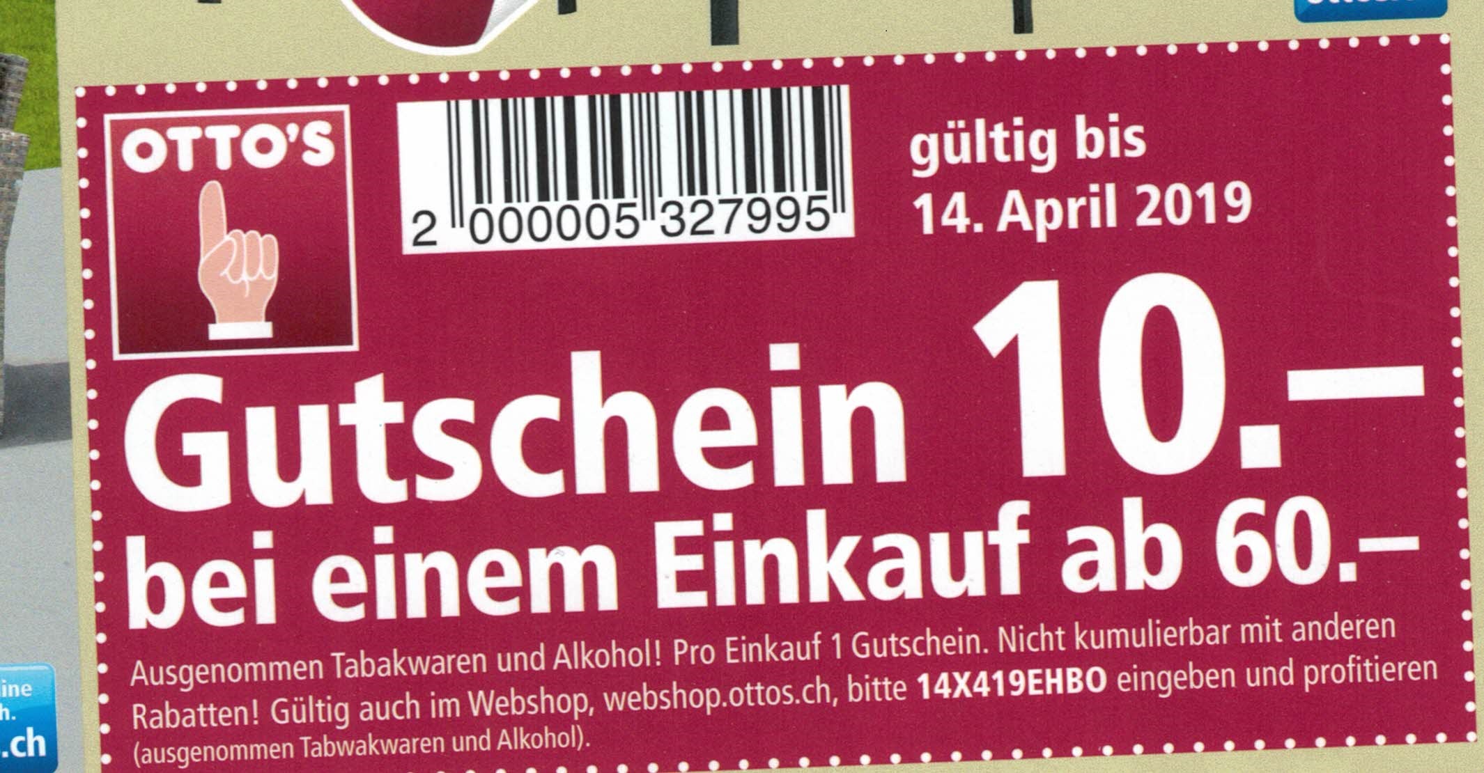 Bei Otto’s gibt es momentan ab einem Einkauf von CHF 60.- bei Eingabe des Codes 14X419EHBO einen Rabatt von CHF 10.- (gültig bis 14.4.2019). Online und in der Filiale einlösbar. Ausgenommen Tabakwaren und Alkohol!
