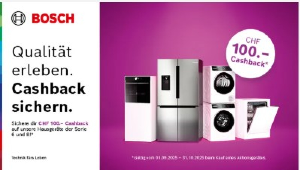 Jetzt von höchster Bosch-Qualität profitieren und gleichzeitig sparen: Wer zwischen dem 1. September und 31. Oktober 2025 ein ausgewähltes Haushaltsgerät der Bosch Series 6 oder Series 8 kauft, erhält CHF 100.– Cashback direkt aufs Konto zurück!