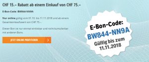 ACHTUNG: Die Aktion ist nur online gültig ab einem Einkauf von CHF 75.– und der E-Bon ist nur einmal einlösbar und nicht kumulierbar mit anderen Bons.