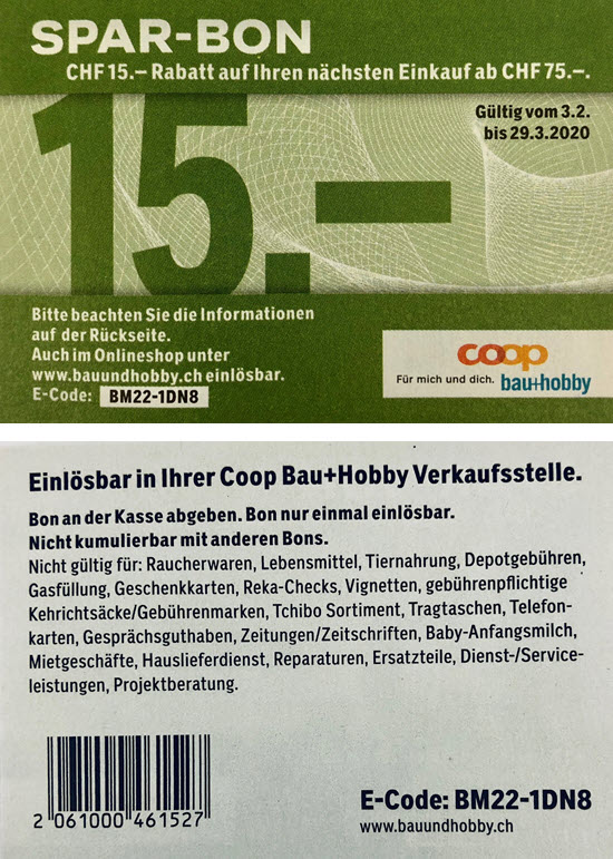Vom 3.2. bis 29.3.2020 gibt es im Onlineshop von Coop Bau + Hobby CHF 15.- Rabatt ab einem Einkauf von CHF 75.- wenn man den Gutscheincode BM22-1DN8 beim Checkout verwendet. Dieser Bon ist nur einmal einlösbar und nicht kumulierbar mit anderen Bons.