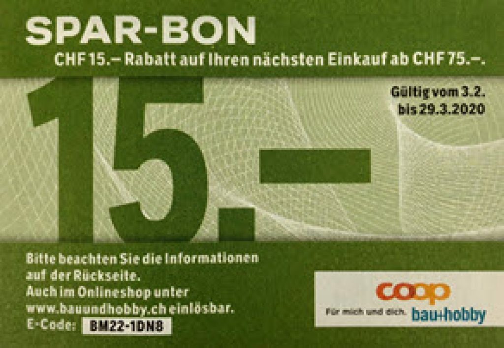 Vom 3.2. bis 29.3.2020 gibt es im Onlineshop von Coop Bau + Hobby CHF 15.- Rabatt ab einem Einkauf von CHF 75.- wenn man den Gutscheincode BM22-1DN8 beim Checkout verwendet. Dieser Bon ist nur einmal einlösbar und nicht kumulierbar mit anderen Bons.