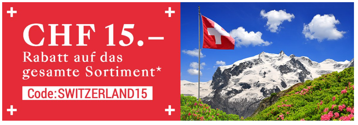 Heute gibt es bei Ochsner Shoes eine Jubiläums-Aktion. Mit dem Code SWITZERLAND15 erhält man CHF 15.- Rabatt auf alles. Ein MBW von CHF 99.95 muss erreicht werden, weitere Einschränkungen sind mir nicht bekannt.