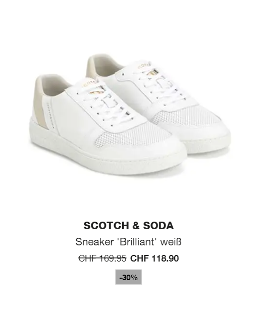 Beispielsweise erhält man so die Scotch and Soda Brilliant Sneaker für CHF ~100.- (Vergleichspreis Zalando CHF 115.-).
