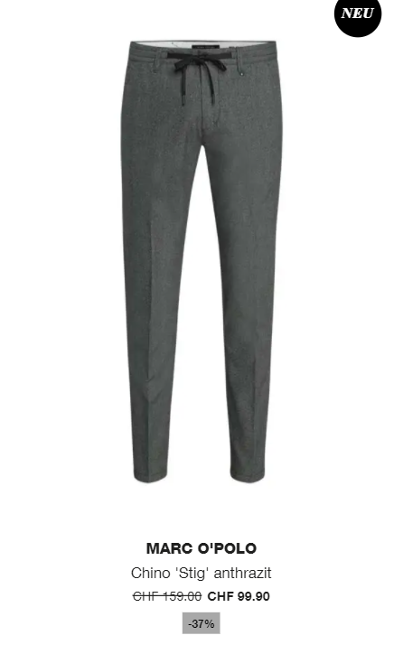 Oder die MARC O’POLO Chino ‚Stig‘ für CHF 79.90 Anstatt CHF 110.- (Fashiola).