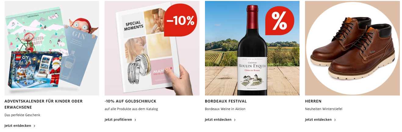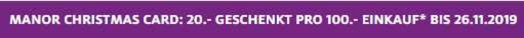 Bei Manor bekommt man bis zum 26.11. ab einem Einkauf von CHF 100.- eine CHF 20.- Manor-Card geschenkt. Wenn man z.B. CHF 200.- ausgibt erhält man 2x von dieser Karte. Maximal erhält man CHF 200.- geschenkt für einen Einkauf von CHF 1000.-.