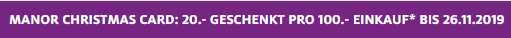 Die Gutscheine sind vom 30.11 bis 24.12.2019 gültig und können in allen Non-Food-Abteilungen der Manor Warenhäuser (exkl. Multimedia und Elektro, Dienstleistungen und Geschenkkarten  eingelöst werden.