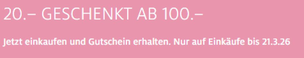 Bei Manor erhaltet ihr aktuell einen CHF 20.- Gutschein geschenkt, wenn ihr im Non-Food-Bereich für mindestens CHF 100.- einkauft. Die Aktion gilt für Einkäufe bis zum 21.3.2026.