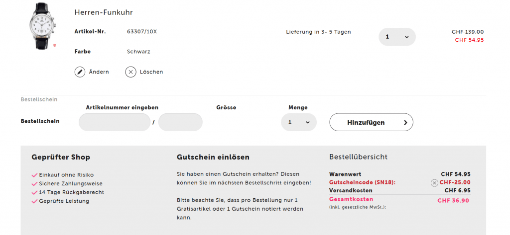 Etwas schade ist, dass noch eine Lieferpauschale von CHF 6.95 bei jeder Bestellung dazukommt, somit hat der Gutschein nur einen tatsächlichen Wert von 18.- Franken - aber immerhin. Hier ein Beispiel - die Uhr hat ursprünglich CHF 139.- gekostet, nun kostet sie noch knapp 37 Franken inkl. Lieferung.