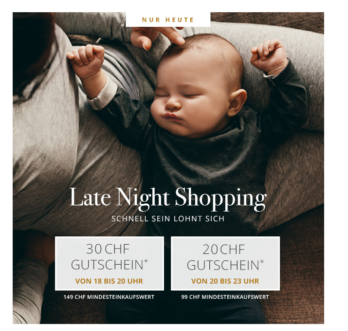 Dein 30 CHF Gutschein ist nur einmalig gültig ab einem Einkauf von 149 CHF am 18.09.2021 von 18.00 bis 20.00 Uhr. Dein 20 CHF Gutschein ist nur einmalig gültig ab einem Einkauf von 99 CHF am 18.09.2021 von 20.00 bis 23.00 Uhr. Barauszahlung nicht möglich. Der Gutschein ist nicht übertragbar und kann nicht in Verbindung mit anderen Aktionen oder bei Kooperationspartnern eingelöst werden. Folgende Marken sind von der Aktion ausgeschlossen: ABC Design, Babyzen, Bugaboo, Doona, HTS BeSafe, Joolz, Kokadi, Limas, Nomi, Nuna, Stokke TrippTrapp, TFK, Thule, UPPAbaby, Britax Römer Premium, GB Platinum, cybex Gold, cybex Platinum, Quinny Premium Line, Maxi Cosi Premium Line. Gib bitte bei Deiner Bestellung oder Deinem Einkauf Deinen Aktions-Code an, damit wir Deinen Gutscheinbetrag verrechnen können. Bei Unterschreitung des Mindesteinkaufswertes durch Rücksendung behalten wir uns das Recht vor, den Gutschein zu stornieren. Der Wert von nicht zurückgesendeten Waren ist in diesem Fall in voller Höhe zu bezahlen. Bitte habe Verständnis dafür, dass wir den Gutscheinbetrag nicht auf bereits getätigte Bestellungen gewähren können. Bücher und Geschenkgutscheine sind von der Aktion ausgeschlossen.