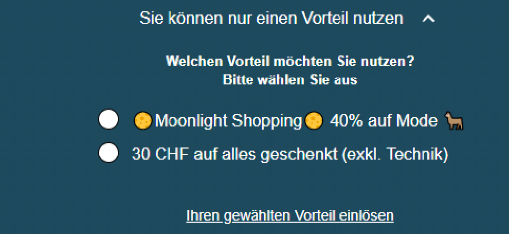 Bis zum 13.02. erhält man mit dem Code 56114 CHF 30.- ab einem MBW von CHF 90.- Rabatt. Alternativ kann man sich für einen 40 % Rabatt auf Mode entscheiden, jedoch kann man diese Aktionen nicht kombinieren (auch nicht mit anderen).