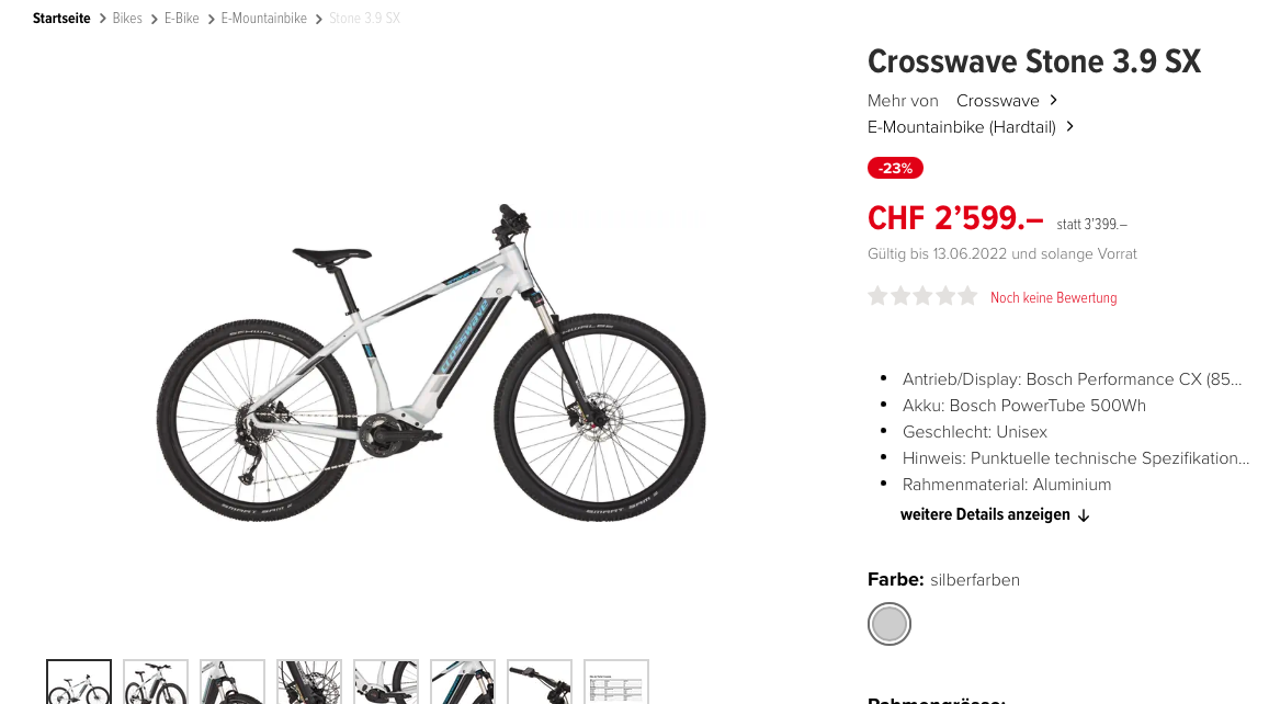 Für alle, die auch beim E-Mountainbike ein Schnäppchen suchen, hat Bikeworld diese Woche ein Angebot für dieses Modell: https://www.bikeworld.ch/de/p/464855705187/crosswave-stone-3-9-sx
