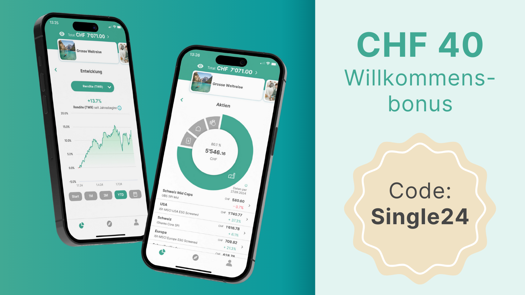 findependent App mit dem Code “Single24” abschliessen und mindestens 500 Franken einzahlen - beides bis spätestens 30. November 2024. Anschliessend zahlen wir dir deinen Willkommensbonus von 40 Franken direkt auf dein findependent Konto.