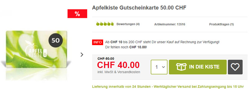 Momentan gibt es bei Apfelkiste.ch eine begrenzte Anzahl von CHF 50.- Gutscheinkarten mit 20% Rabatt für den Preis von CHF 40.-. Wenn man vorgängig via diesem Profity-Link noch einen CHF 5.- Rabattcode von Apfelkiste löst, kann man diesen beim Checkout gleich verwenden und zahlt somit schlussendlich nur noch CHF 35.-.