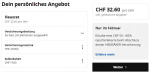 Die günstigsten Versicherungen kosten weniger als CHF 50 = Sie können mit dem Abschluss der Versicherung Geld verdienen (in Form eines Ikea-Gutscheins).