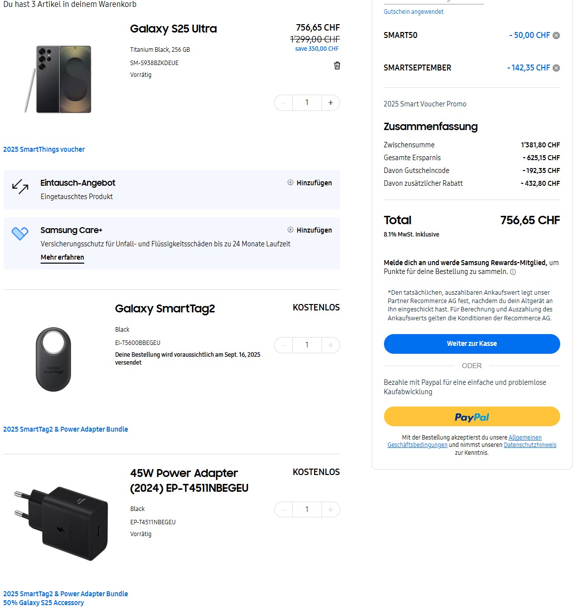 Mit der Kombination der beiden Gutscheincodes SMARTSEPTEMBER und SMART50 lassen sich auch noch weitere Produkte zu einem guten Kurs abstauben. Das S25 Ultra mit 256GB kostet damit beispielsweise CHF 756.65, was den bisherigen Bestpreis von vor 3 Wochen nochmals um ein paar Franken unterbietet.