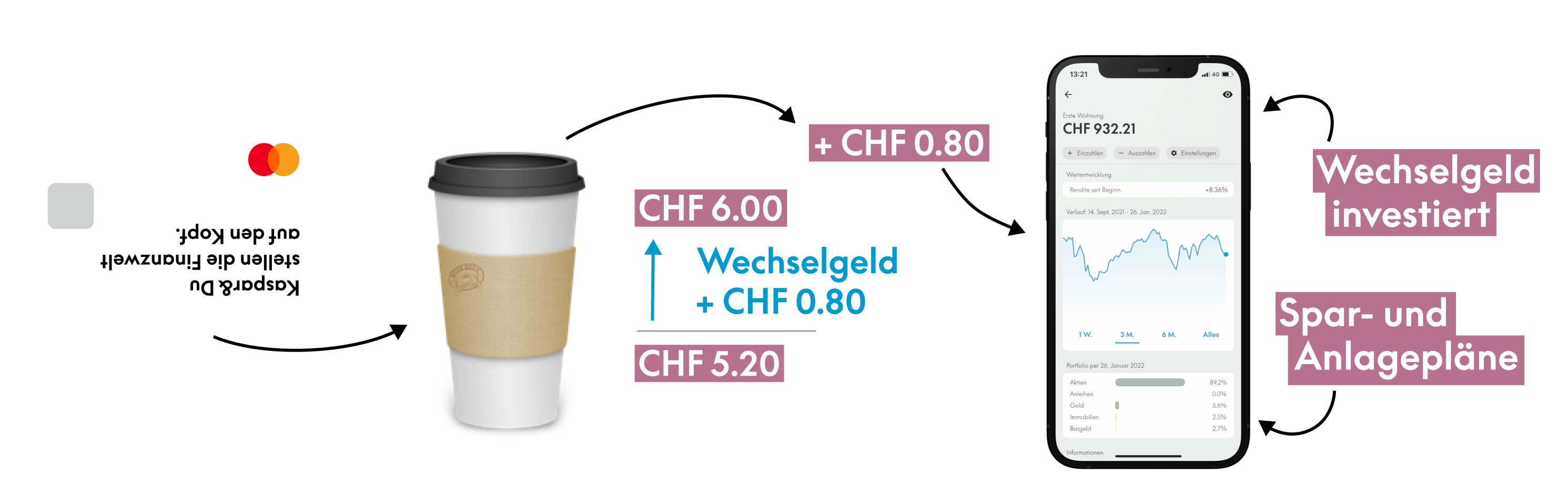 Weltweit gebührenfrei bezahlen, Wechselgeld aufrunden und automatisch anlegen. Starte bereits mit einem Franken!