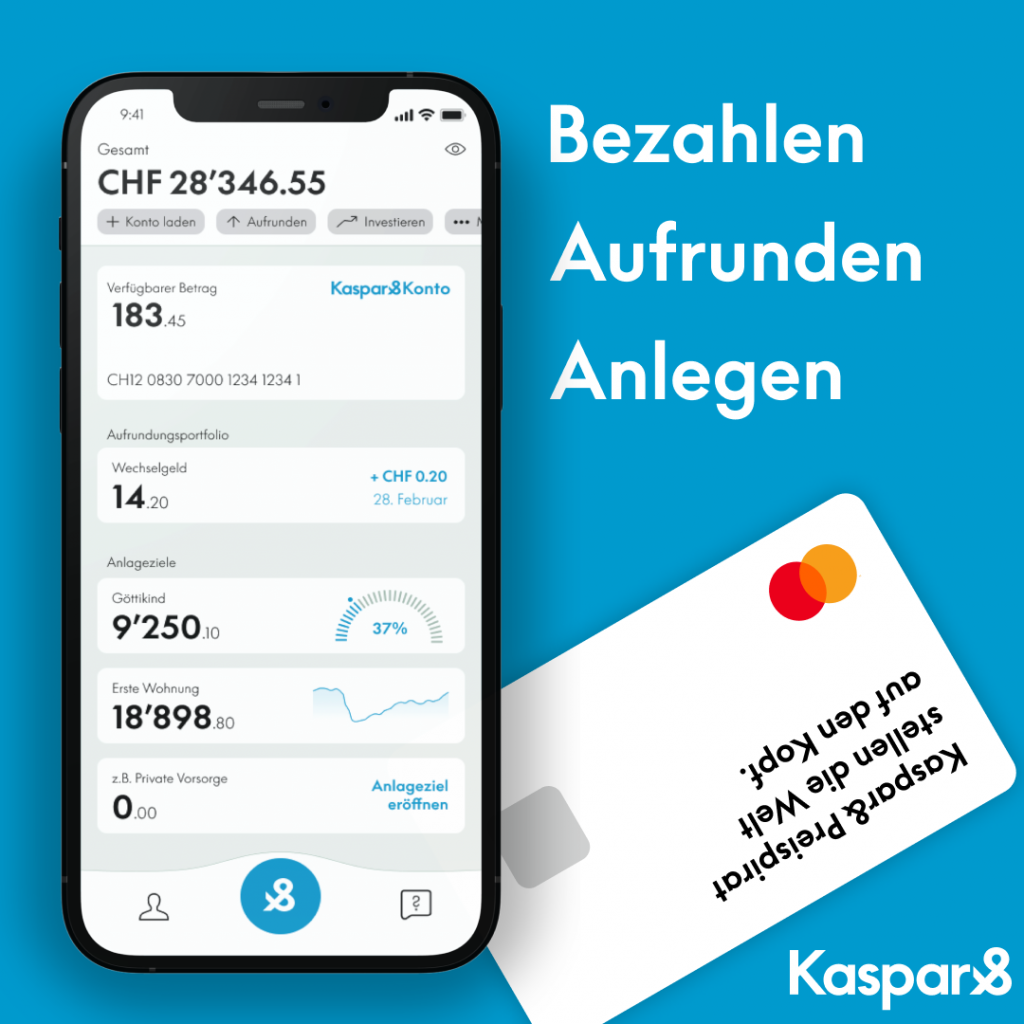 Kaspar& ist die zugänglichste Anlagelösung der Schweiz: Bereits mit Wechselgeld machen wir professionelles Investieren für alle möglich. Mit der Kaspar& App und der zugehörigen Kaspar& Prepaid Kreditkarte inkl. Schweizer Bankkonto bezahlst Du nicht nur weltweit gebührenfrei, sondern rundest mit jeder Zahlung automatisch auf den nächsten Franken auf und investiert die Differenz direkt in ein von Dir gesetztes Anlageziel (z.B. “Sparen für Göttikind”, “Vorsorge” oder “Weltreise”). Zudem kannst Du in der Kaspar& App jederzeit beliebig viele weitere Anlage- und Sparpläne eröffnen und in diese flexibel ein- und auszahlen. Während Deine Anlagen professionell verwaltet werden, kannst Du dich zurücklehnen und alles jederzeit in der Kaspar& App steuern und überwachen.
