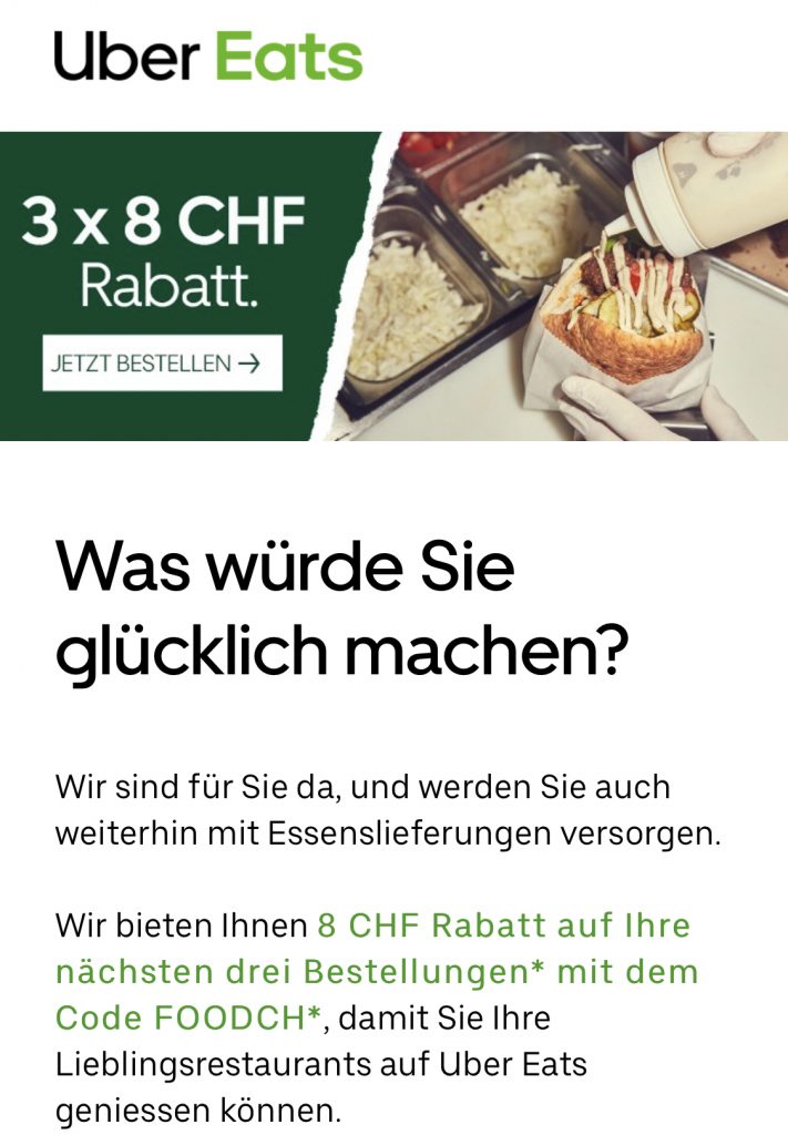 CHF 8.- Rabatt für die ersten 3000 Bestellungen bei Uber Eats
