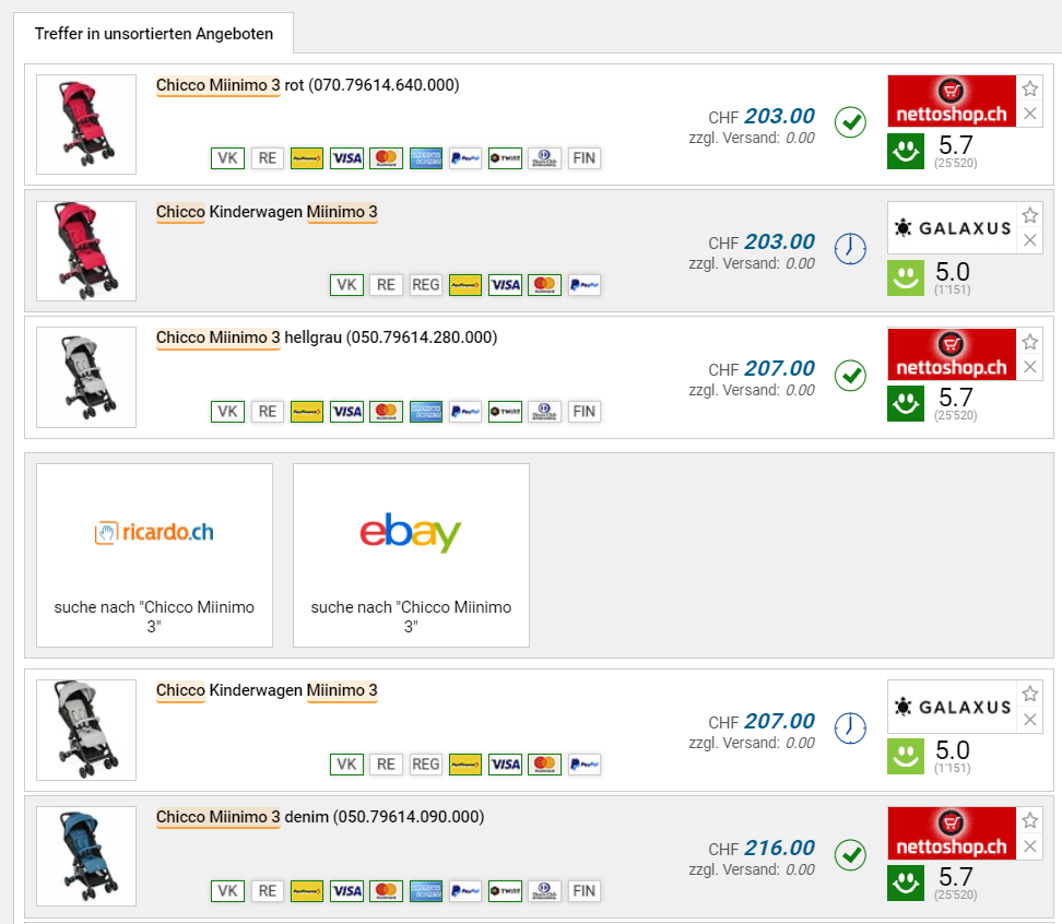 Bei nettoshop gibts gerade den Kinder“sport“wagen Chicco Miinimo 3 inkl. einem Brettspiel zum Aktionspreis von 149 Franken. Mit dem Code „VISNET-20-1912“ lassen sich zudem nochmal 20 Franken sparen. Einen fairen Vergleichspreis zu finden gestaltet sich schwierig, wenn man das Teil importieren würde, so kostete es wohl ca. 170 Franken mit dem Brettspiel zusammen.