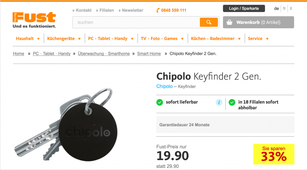 Der Keyfinder kostet 19.90 CHF inklusive Versand kommst du auf einen Preis von 28.40 was aktuell immer noch der beste Preis auf dem Markt ist (Apfekliste kommt mit 31.90 knapp dahinter) Einen Preisverlauf konnten wir online leider nicht finden.